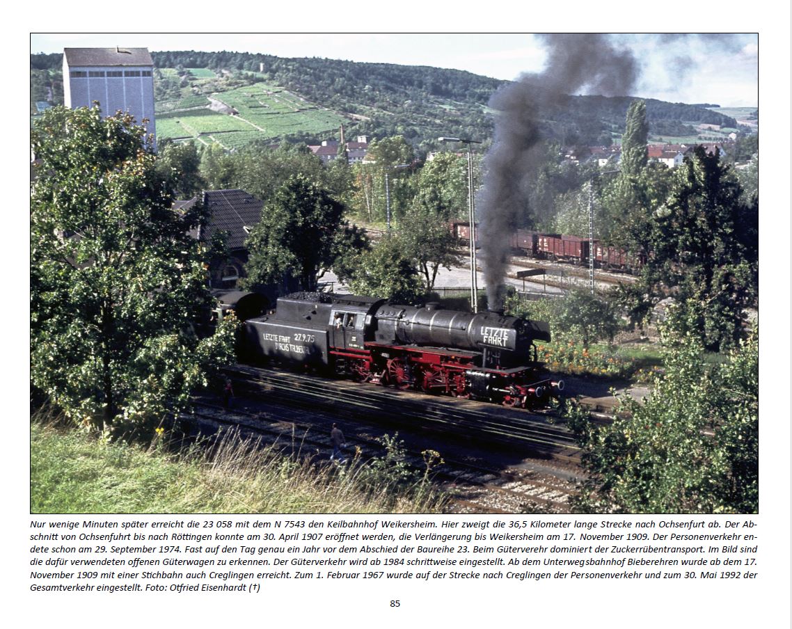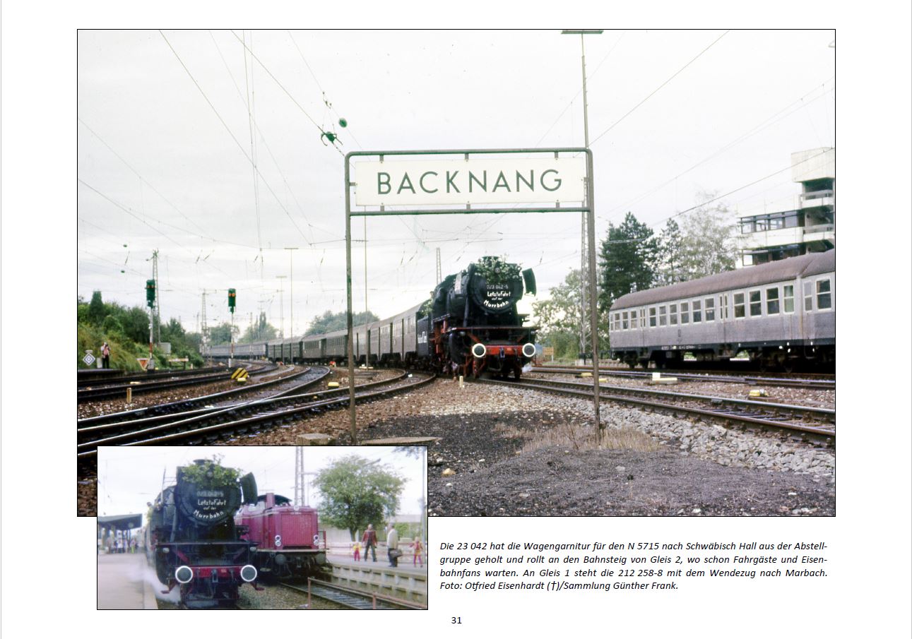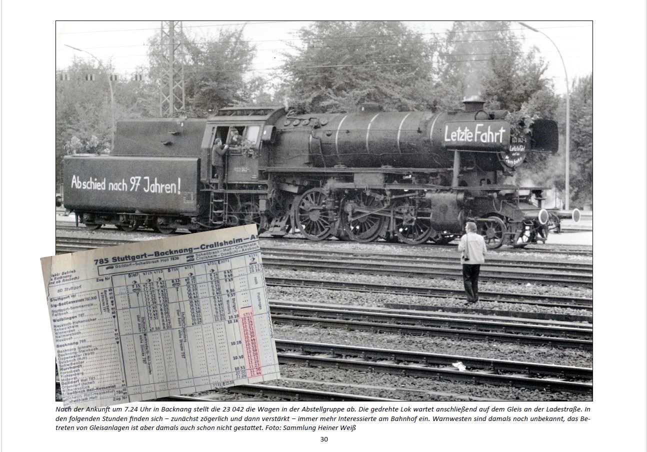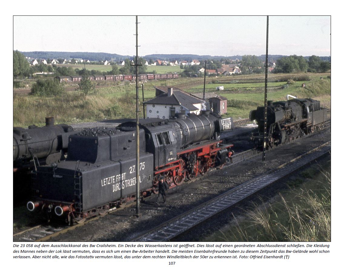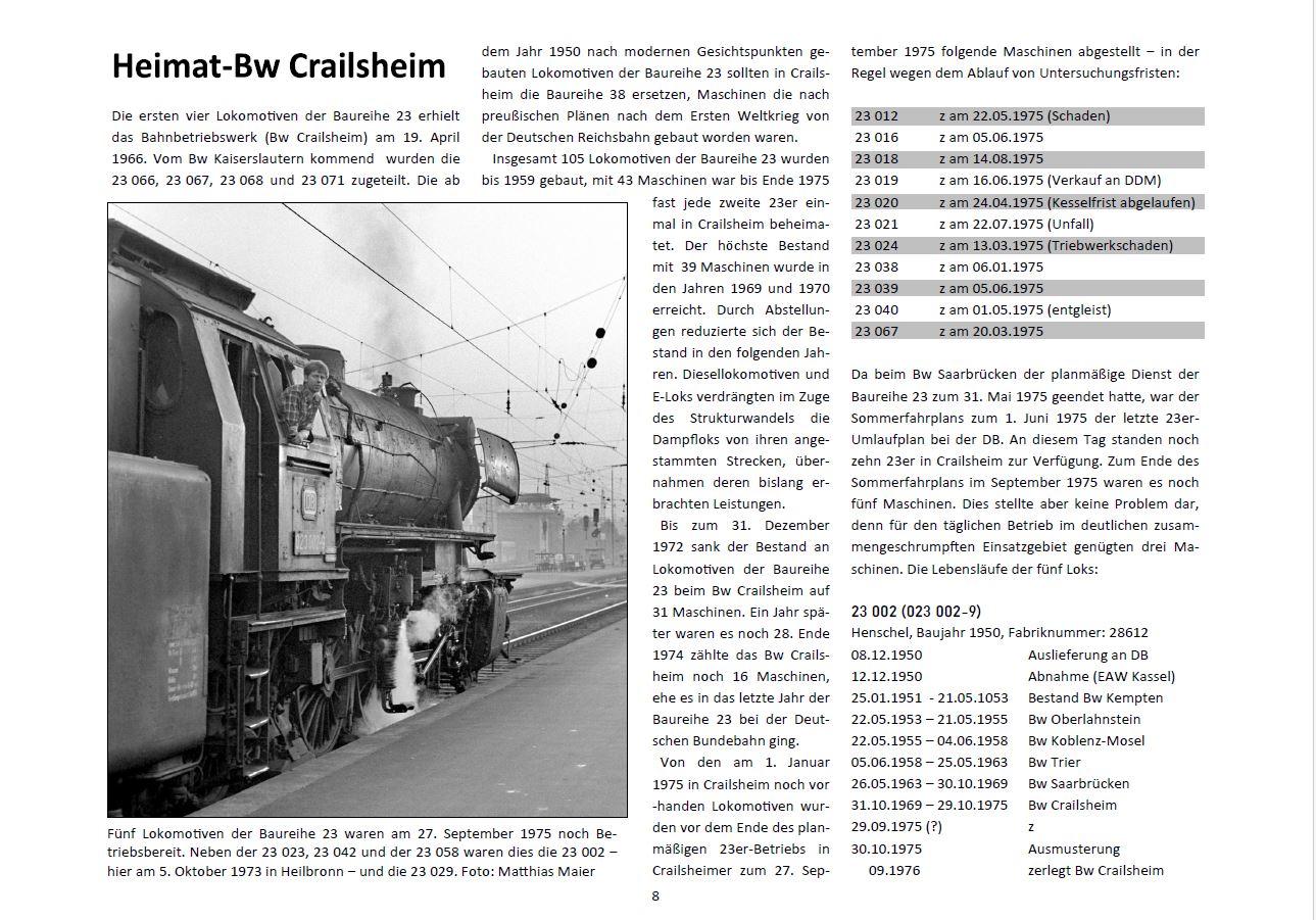 Die Buchreihe ist somit eine Hommage an die Menschen auf der 23er und so natürlich auch eine Erinnerung an die etwa 105 Jahre währende Dampflokzeit in Crailsheim – allerdings auch an ihr Ende vor knapp 50 Jahren, als die Verschrottung von Dampflokomotiven zum willkommenen Arbeitsbeschaffungsprogramm für die nicht mehr benötigten Lokschlosser des Bahnbetriebswerks Crailsheim wurde.
