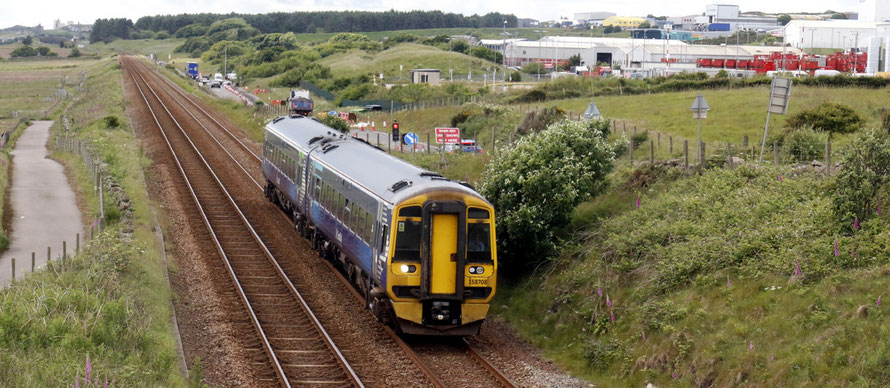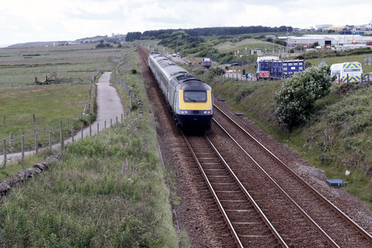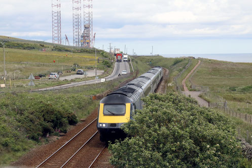 Das Bild oben zeigt den Zug auf der Fahr tvon Aberdeen in Richtung Süden mitden Lokomotiven 43 151 (oben) und 43 037 rechts. Die Gitterkonstruktionen im Hintergrund gehören zu einer Bohrinsel, die in einem Hafen von Aberdeen liegt.