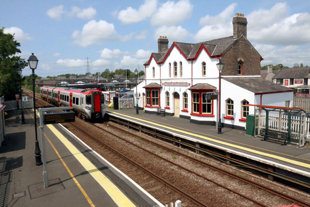 Hier durcheilt ein Evero vom Fährhafen Holyhead den Bahnhof in Richtung Britannia Bridge. Der Elektrodieselzug der Klasse 805 wird vom Unternehmen Avanti West Coast betrieben. Die 200 km/h schnellen Intercity-Züge wurden Hitachi Rail geliefert. Die fünfteiligen Elektrodieselzüge verkehren auf der Strecke London–Nordwales.