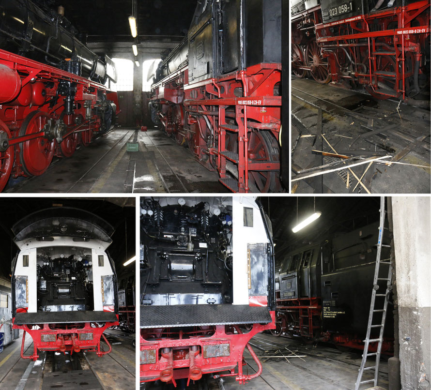50 622 und 23 058, die einen neuen Führerstandsboden erhält, nebeneinander im Schuppen.