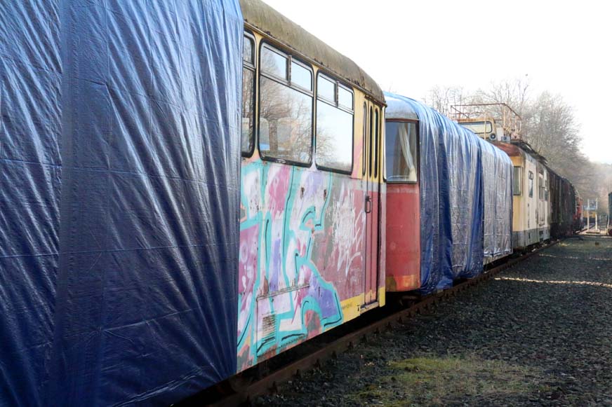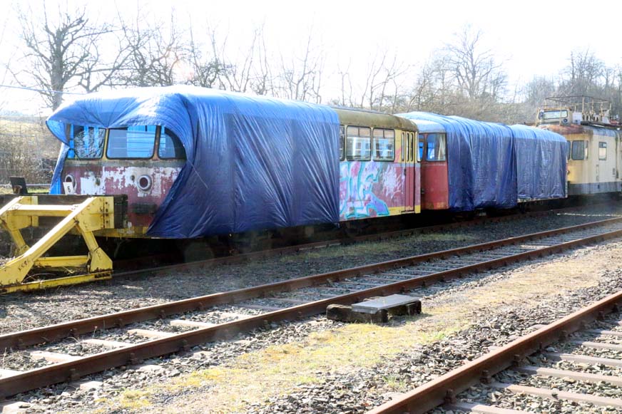 Auf dem Freigelände wurde ein von der Museumeiseisenbahn Losheim stammender „Hecht“ aufgestellt. Doch von dem guten Zustand des Wagens ist nicht mehr viel geblieben. Insgesamt nagt der Zahn der Zeit an den Anlagen.